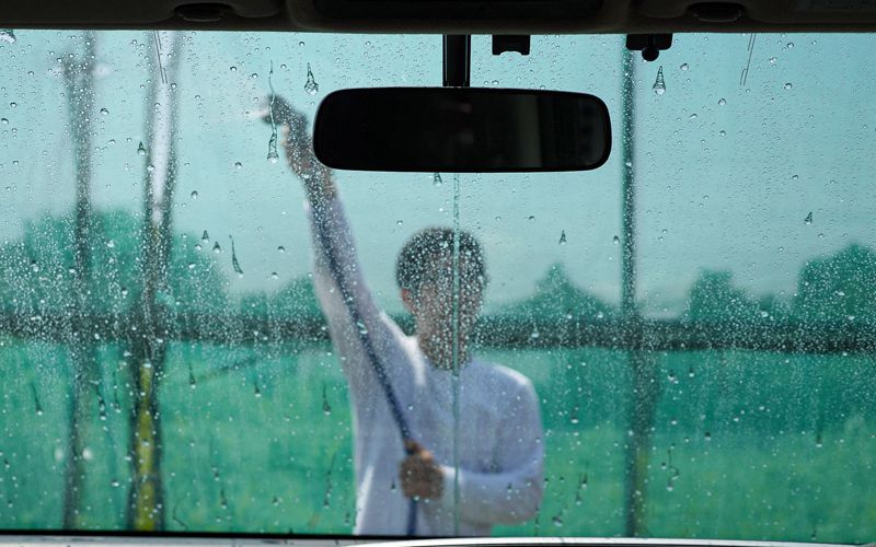 左側の画像は、さっきとは反対側の角度から水をかけた時の様子。右側の画像は、正面から水をかけている状態を車内から見た時の様子。