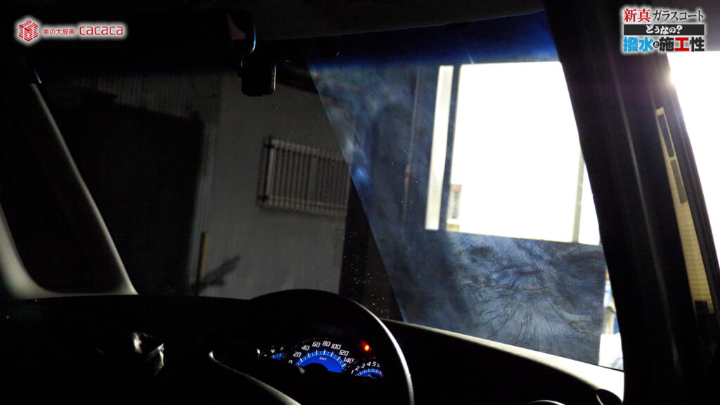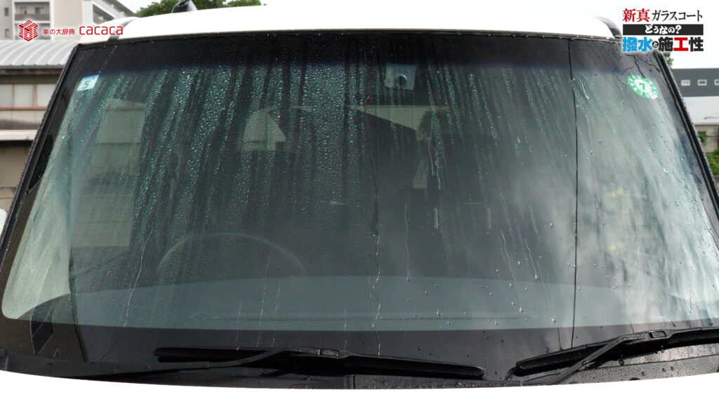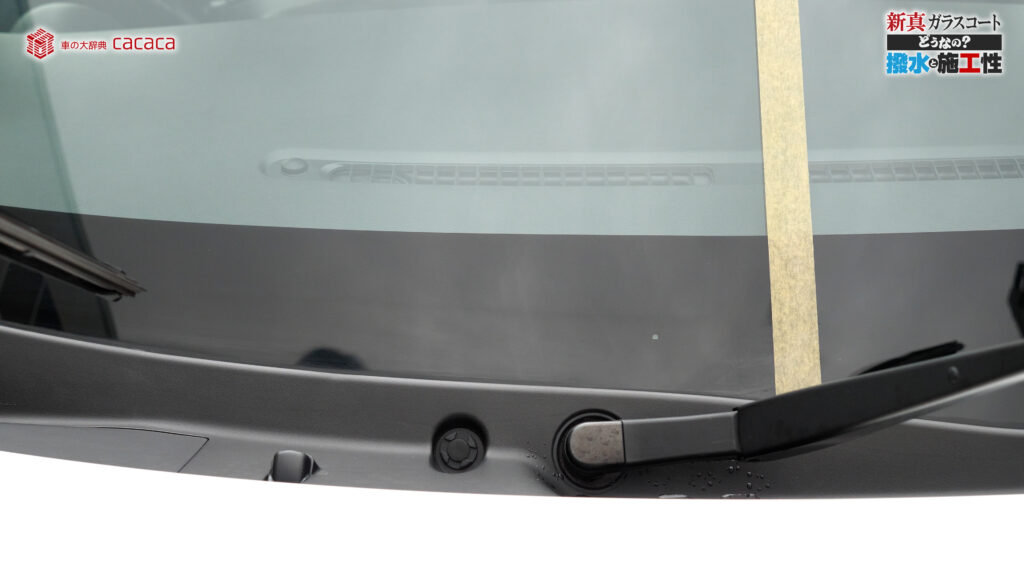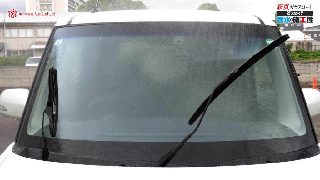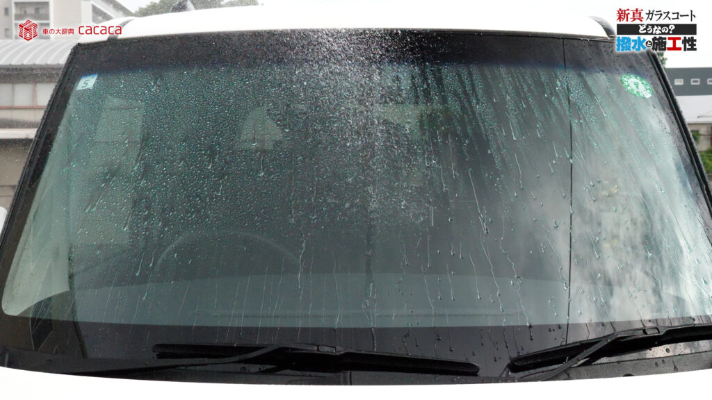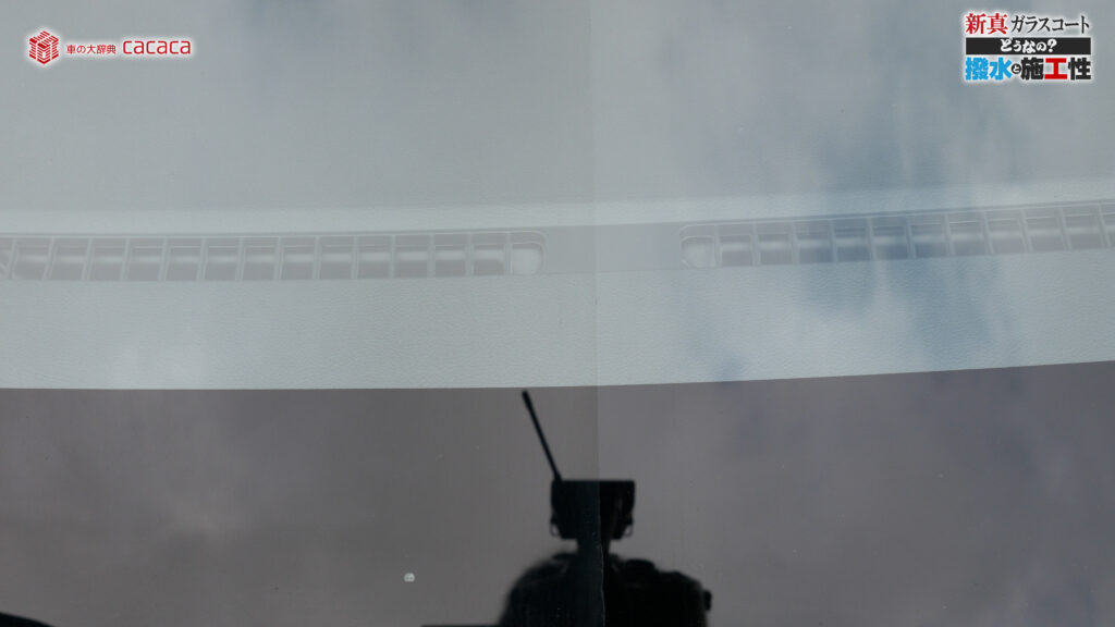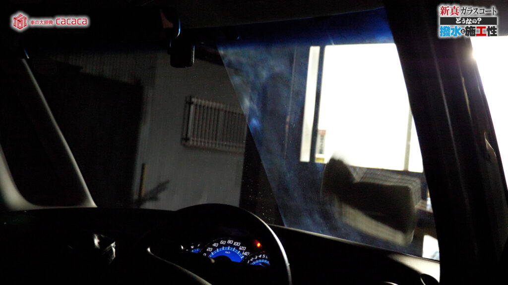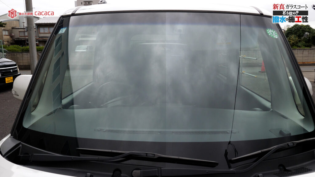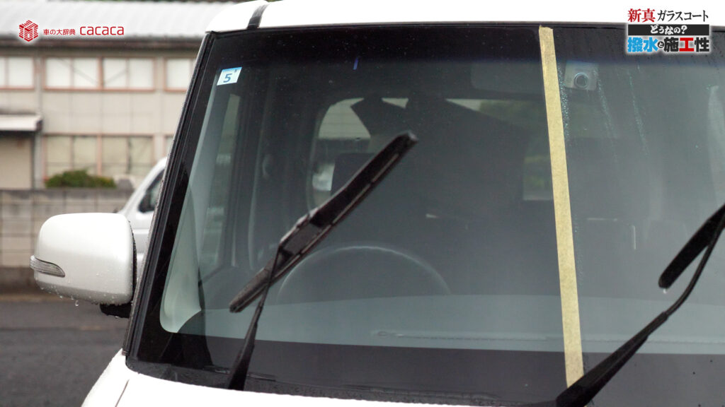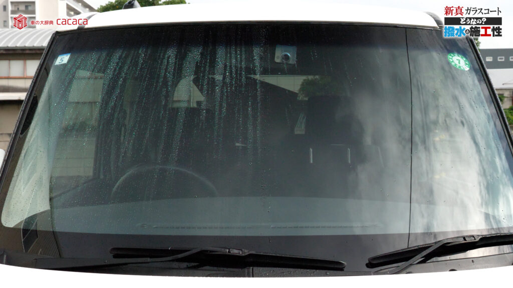あと新真ガラスコートの方は耐久性がメインです。とはいえ、新真ガラスコートの方も撥水してて、何も施工していないものに比べれば、全然弾いてます。見やすくなってます。