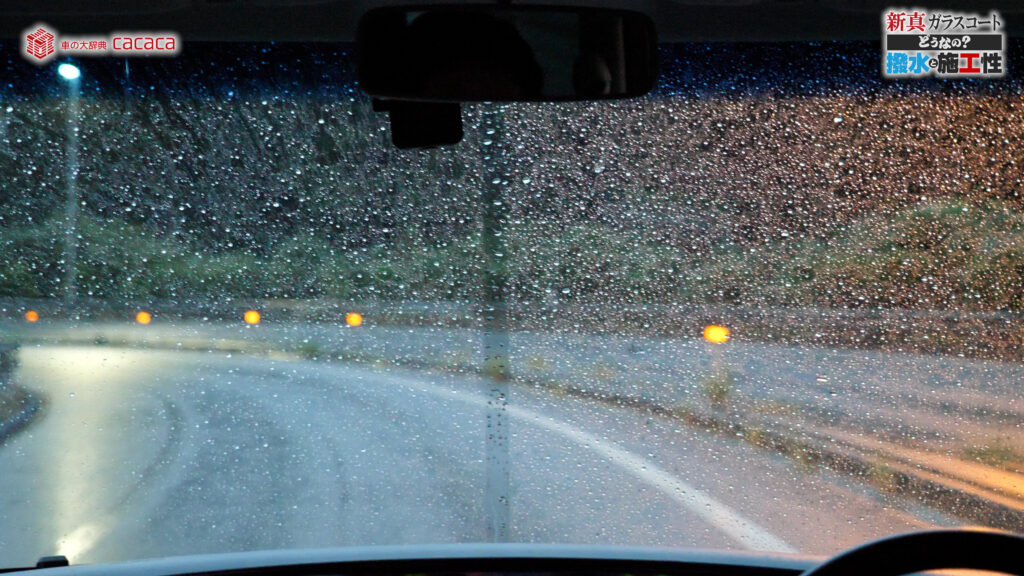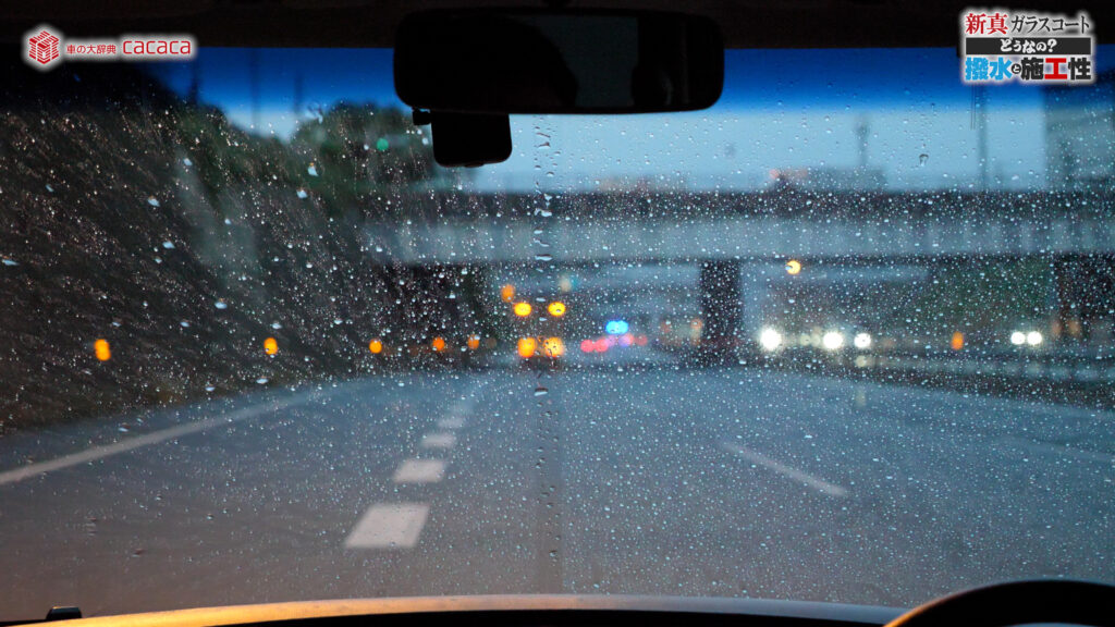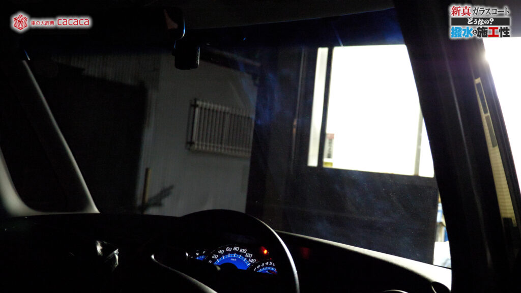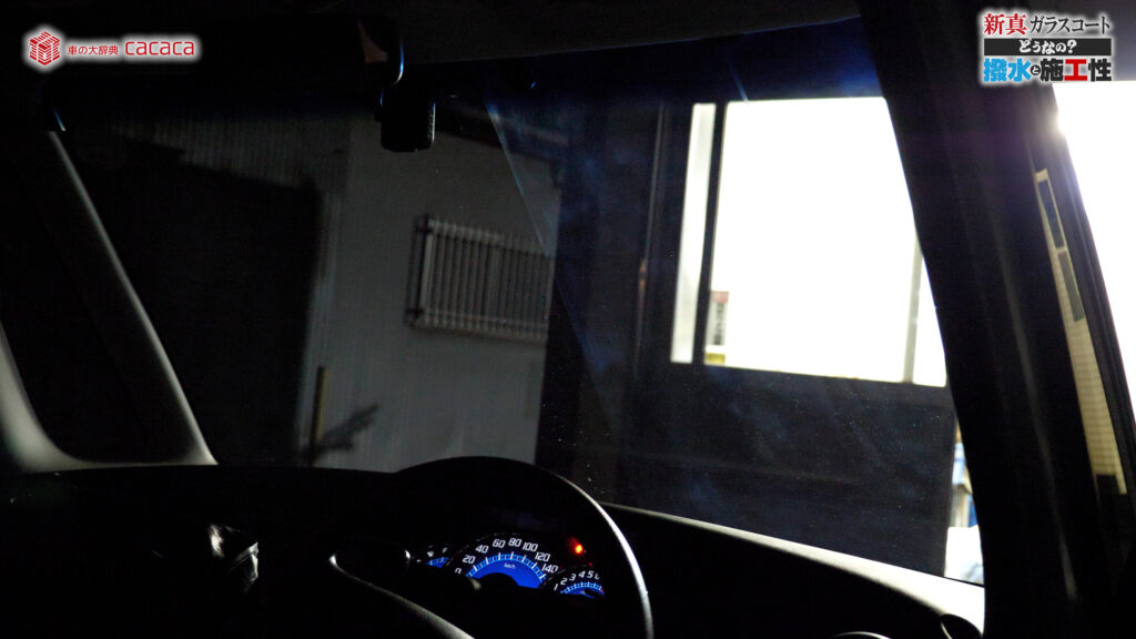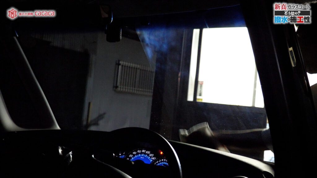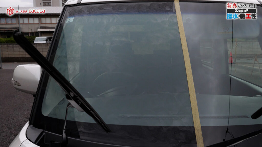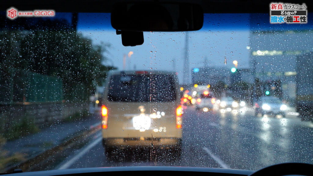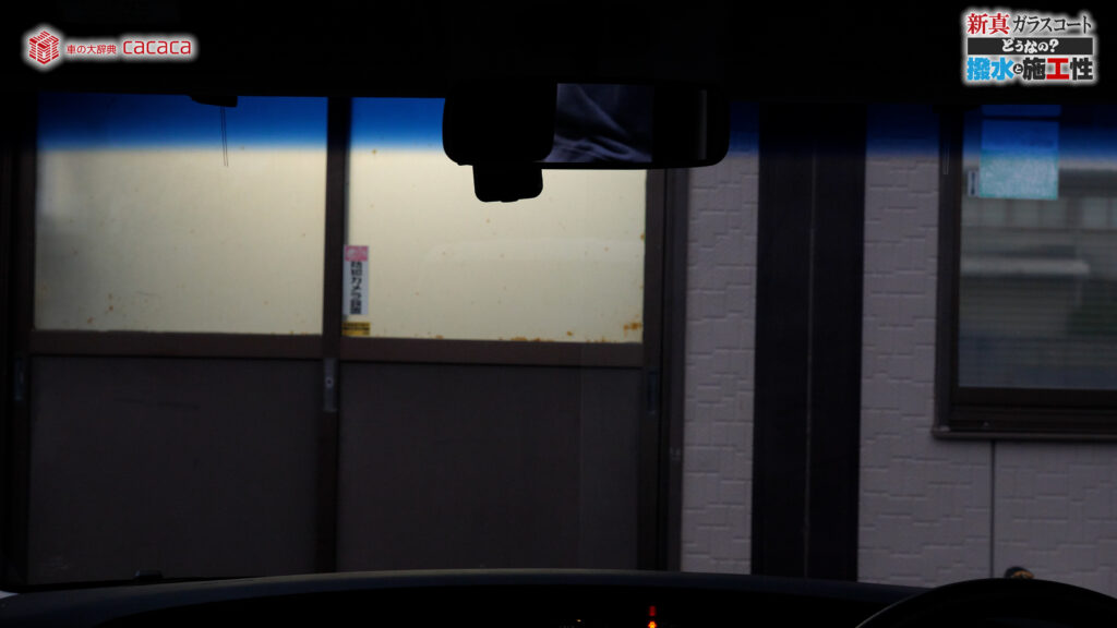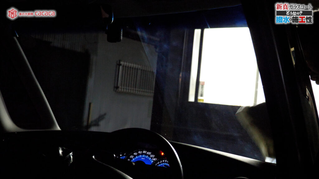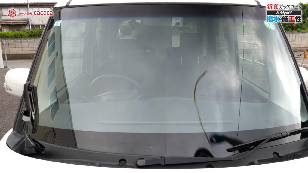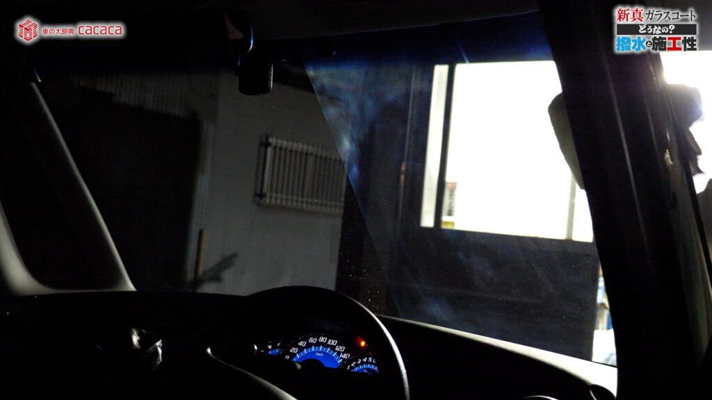 あと新真ガラスコートの方は耐久性がメインです。とはいえ、新真ガラスコートの方も撥水してて、何も施工していないものに比べれば、全然弾いてます。見やすくなってます。
