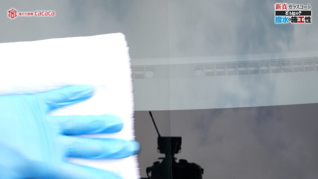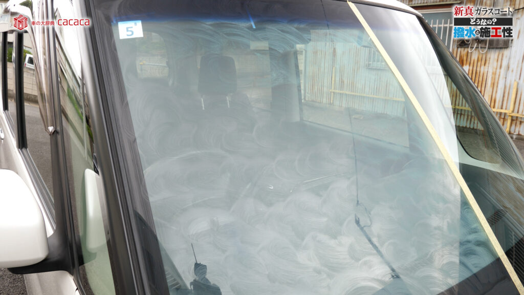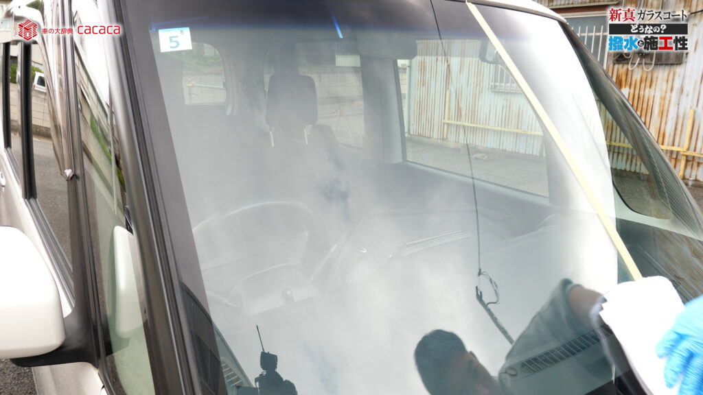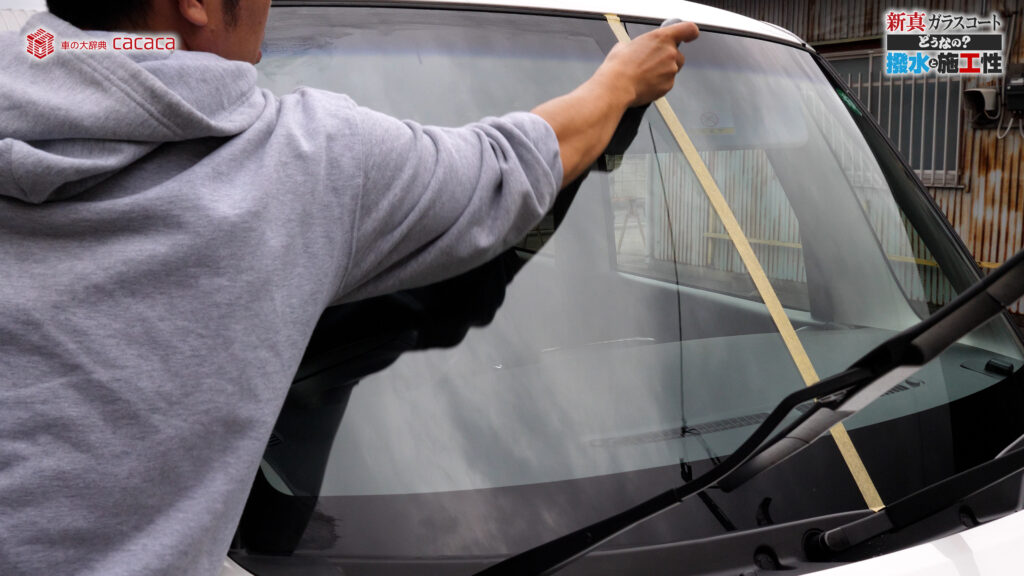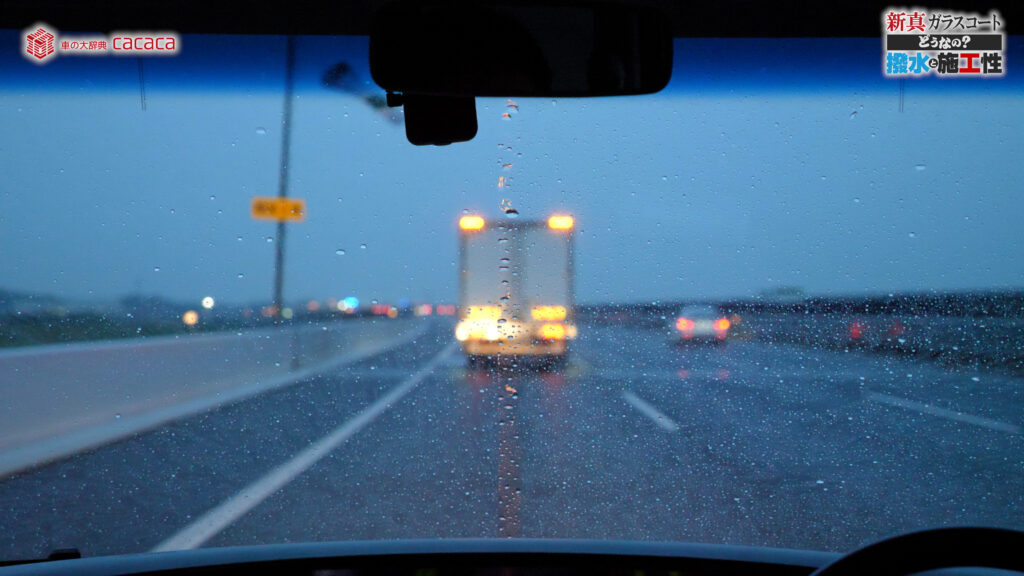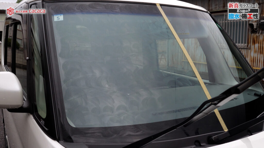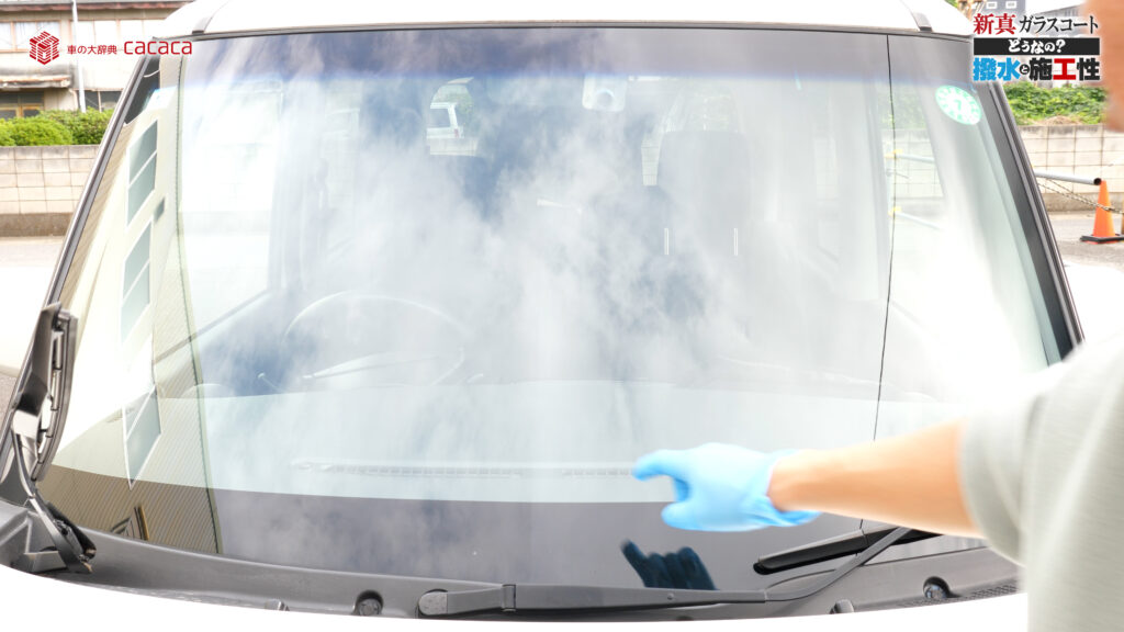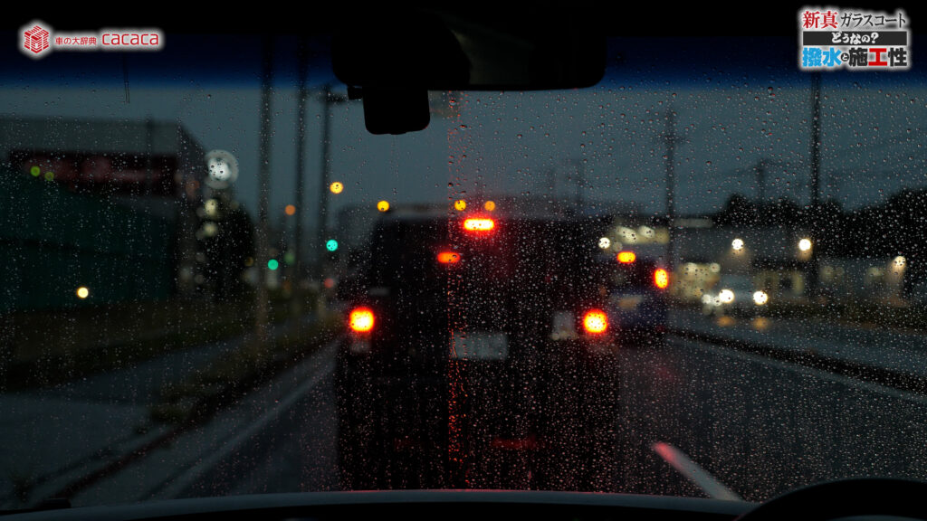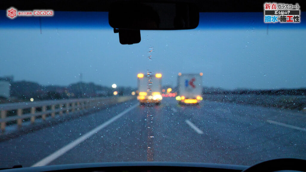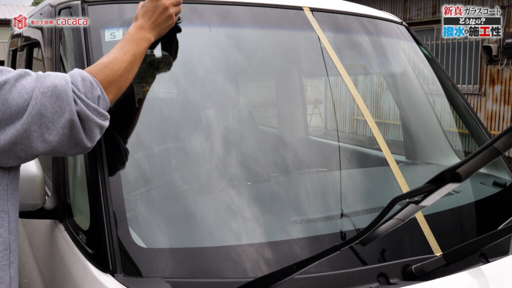 あと新真ガラスコートの方は耐久性がメインです。とはいえ、新真ガラスコートの方も撥水してて、何も施工していないものに比べれば、全然弾いてます。見やすくなってます。