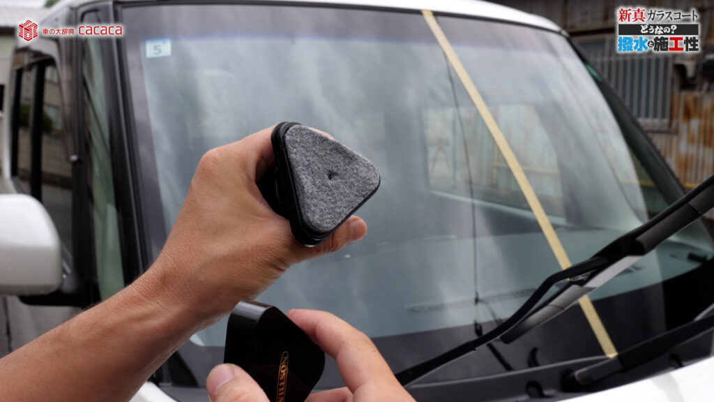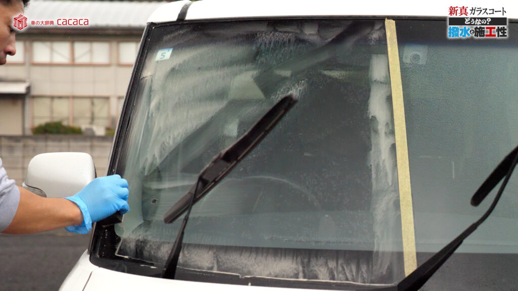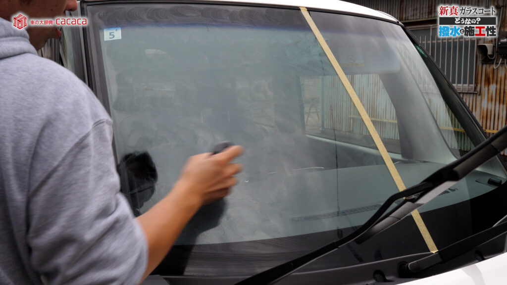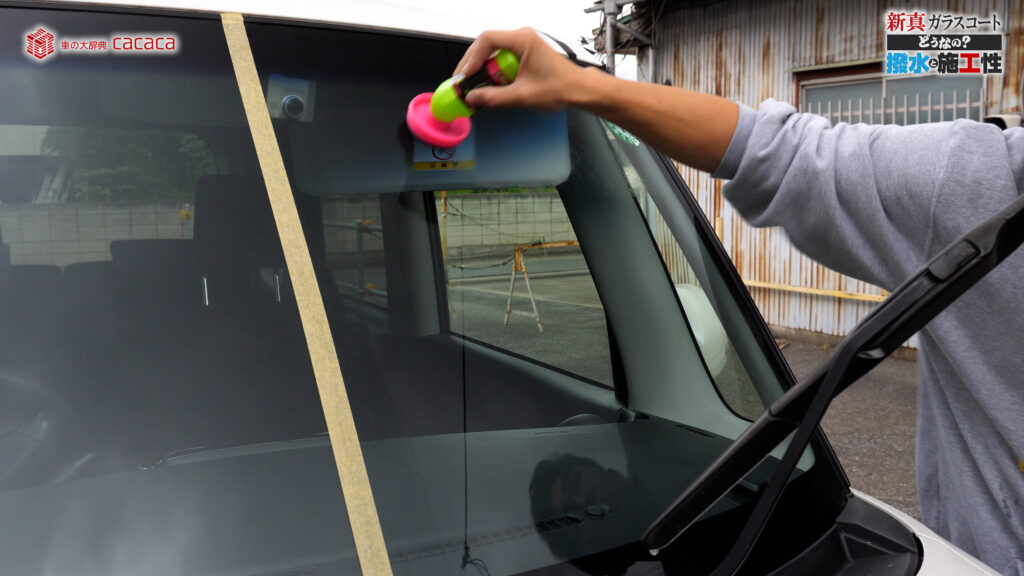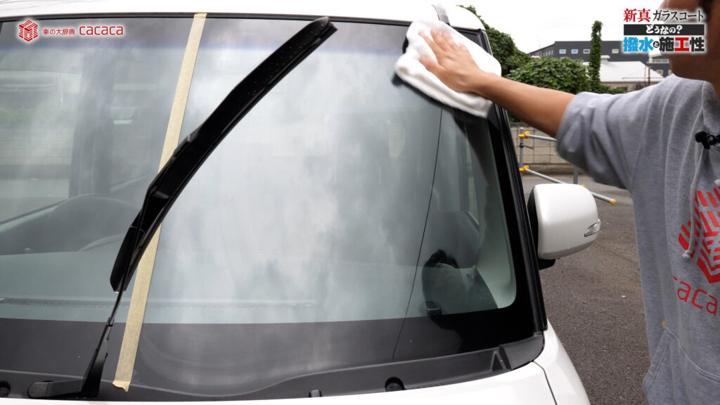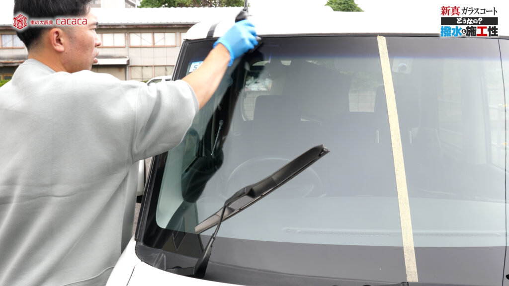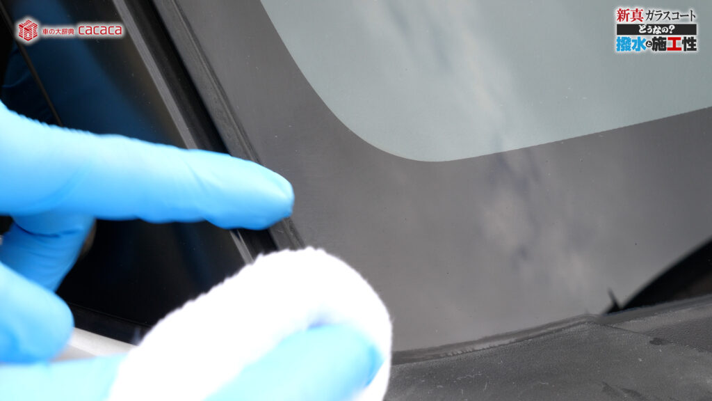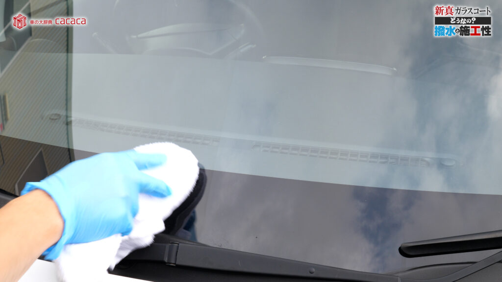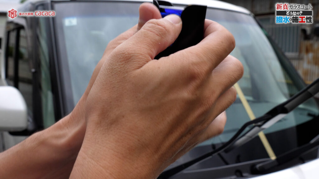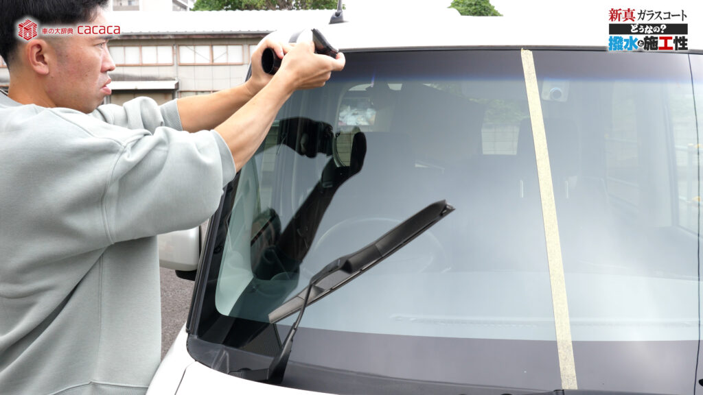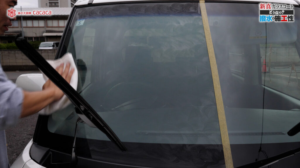 あと新真ガラスコートの方は耐久性がメインです。とはいえ、新真ガラスコートの方も撥水してて、何も施工していないものに比べれば、全然弾いてます。見やすくなってます。