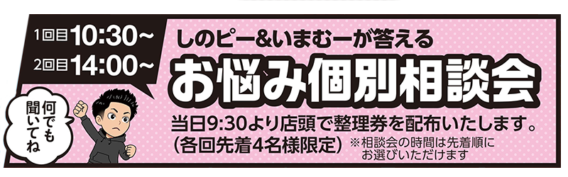 個別に洗車の悩み(この汚れはどうすればいいのか?)なんでも大丈夫です! 洗車以外に聞きたいことがあれば何でも聞いてください! しのピーといまむーが真摯に相談に乗ってくれます(笑)先着8名様限定(午前4名様・午後4名様)になります。当日9時30分から受付開始、相談会の時間は先着順でお選び可能となっております!