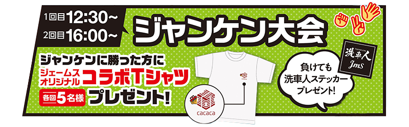 午前と午後にジャンケン大会が開催されます!勝者(10名様)にはまだ世に出ていないcacacaのロゴからじぇいもんがヒョッコリ覗いている「車の大辞典cacaca✖️ジェームス コラボTシャツ」をプレゼント! 負けても「洗車人ステッカー」がもらえるので参加してください!