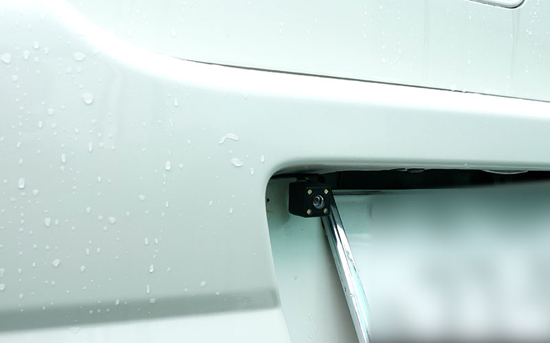 夜間走行のリアカメラです。信号待ちくらいの車間距離ならなんとかナンバーを読み取ることができますが、少し離れると白飛びして車種すら特定できません。