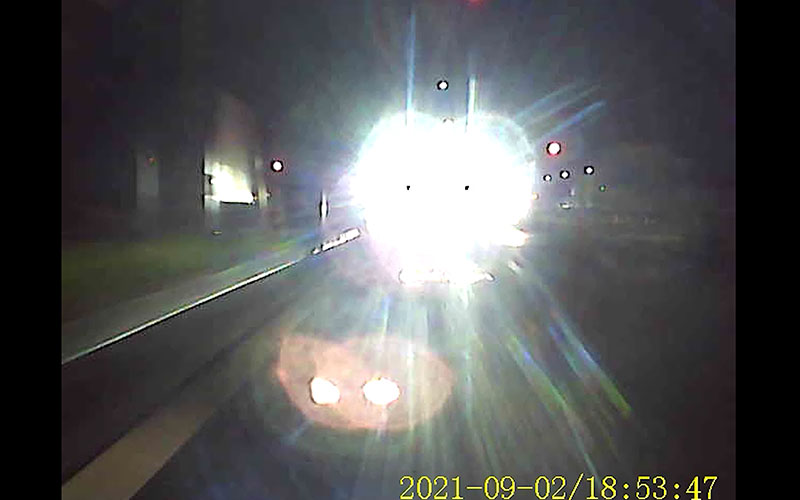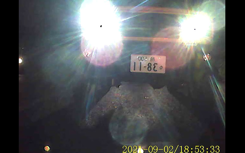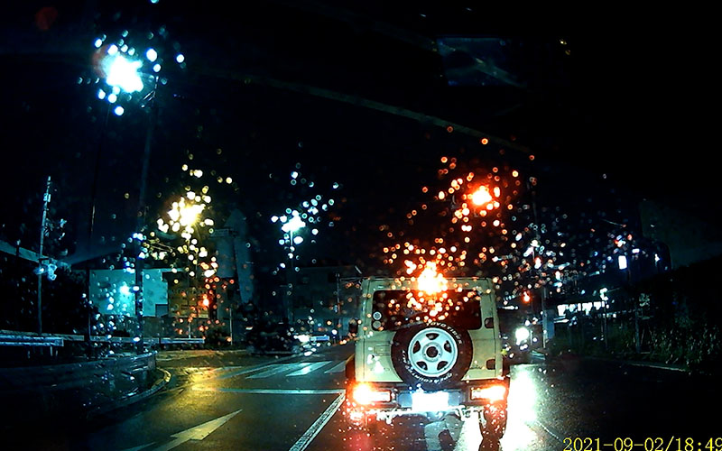 夜間走行の前方カメラです。光に弱いのか白飛びしまくっていて信号待ちくらいの車間距離でもナンバーを読み取ることができません。