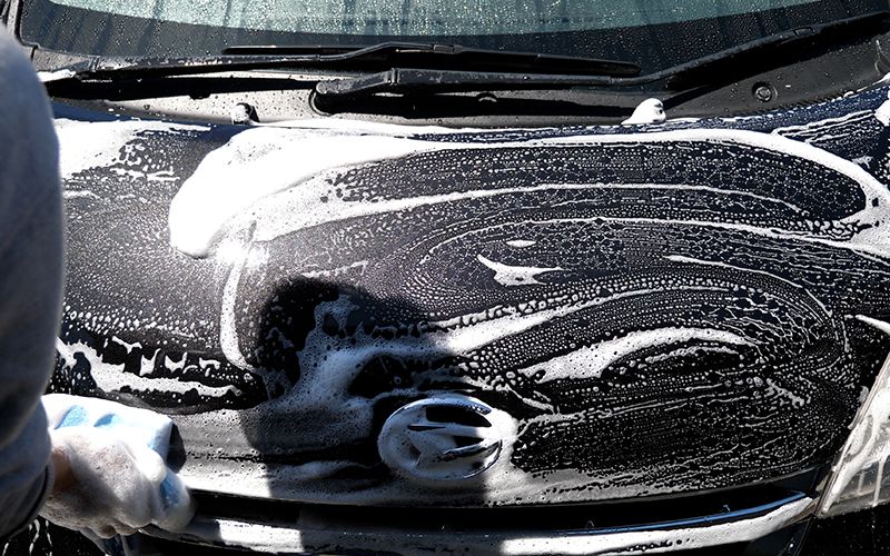 表面の汚れを取り除いた状態の効果を確認するために一度洗車を行いました。シャンプーで汚れを取り除きます。
