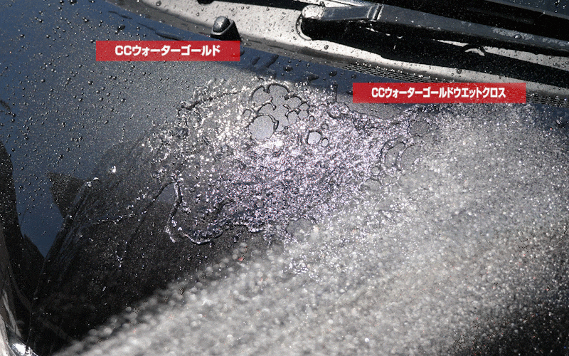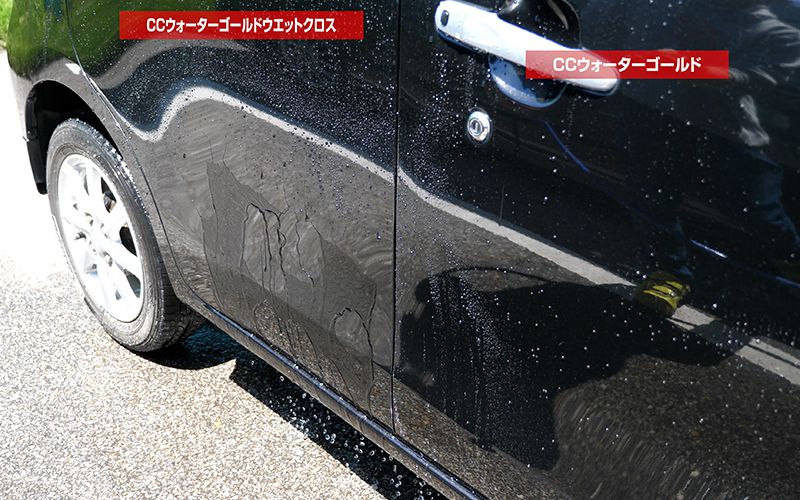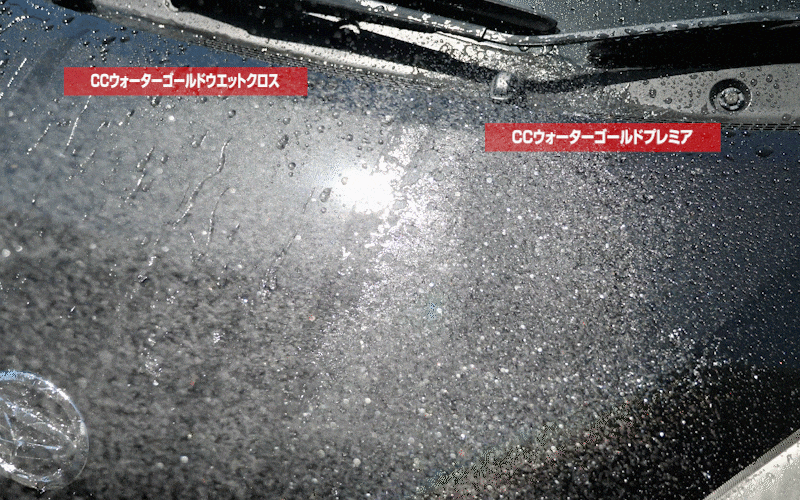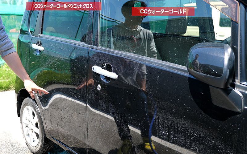 こちらが洗車後。右が『ウエットクロス』、左が『CCウォーターゴールド』です。