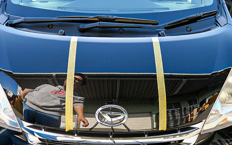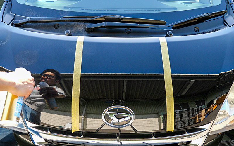 ボンネットはマスキングテープで3分割し、左側から『CCウォーターゴールド』『CCウォーターウエットクロス』『CCウォーターゴールドプレミア』の順に施工していきたいと思います。