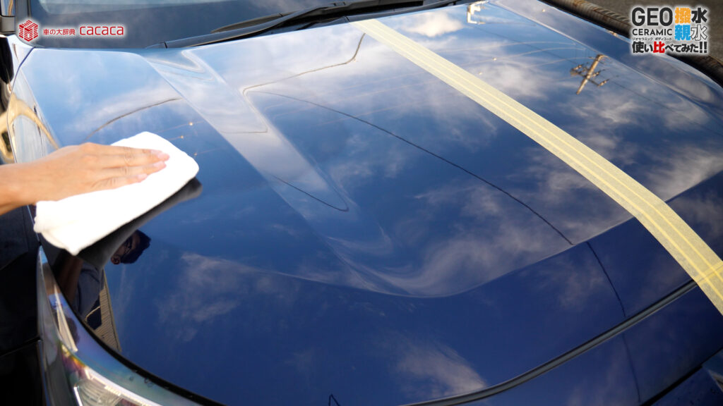 撥水タイプの方が乗り込みからちょっと重い拭き取りになると、さらに重いんですよね。だけど 塗ってるところからツヤ出てるなっていう感じが見受けられる。