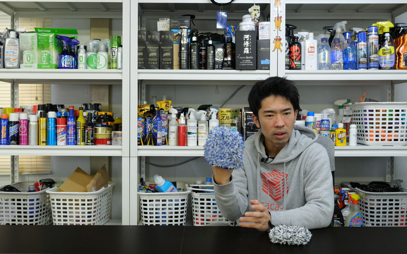 指4本ぐらい入って、ここにヒモみたいなやつが付いています。ここに指を通して、ホイールの表面って言うのかな?を洗っていくといったミットなんですよ。