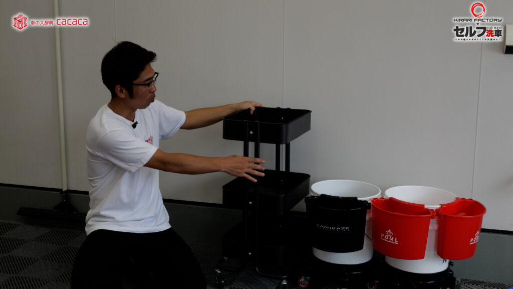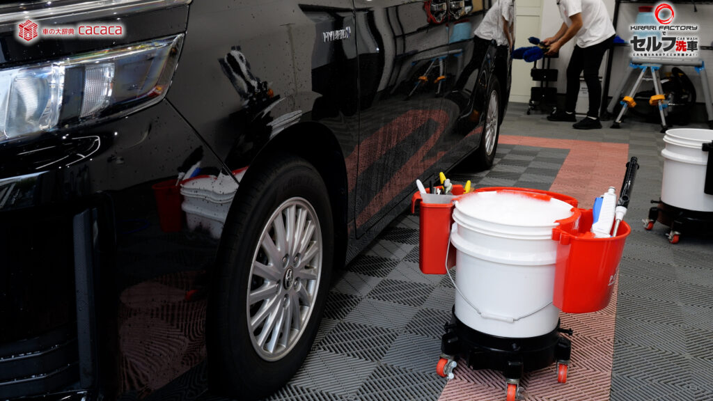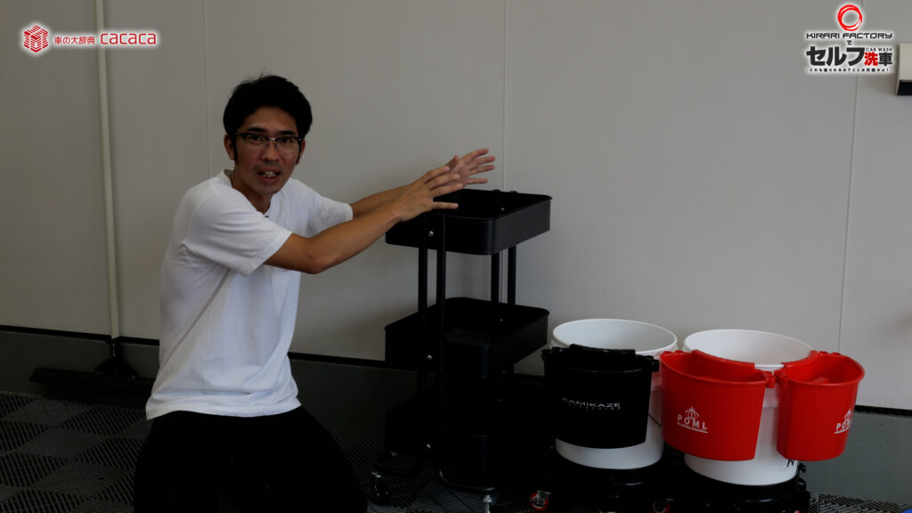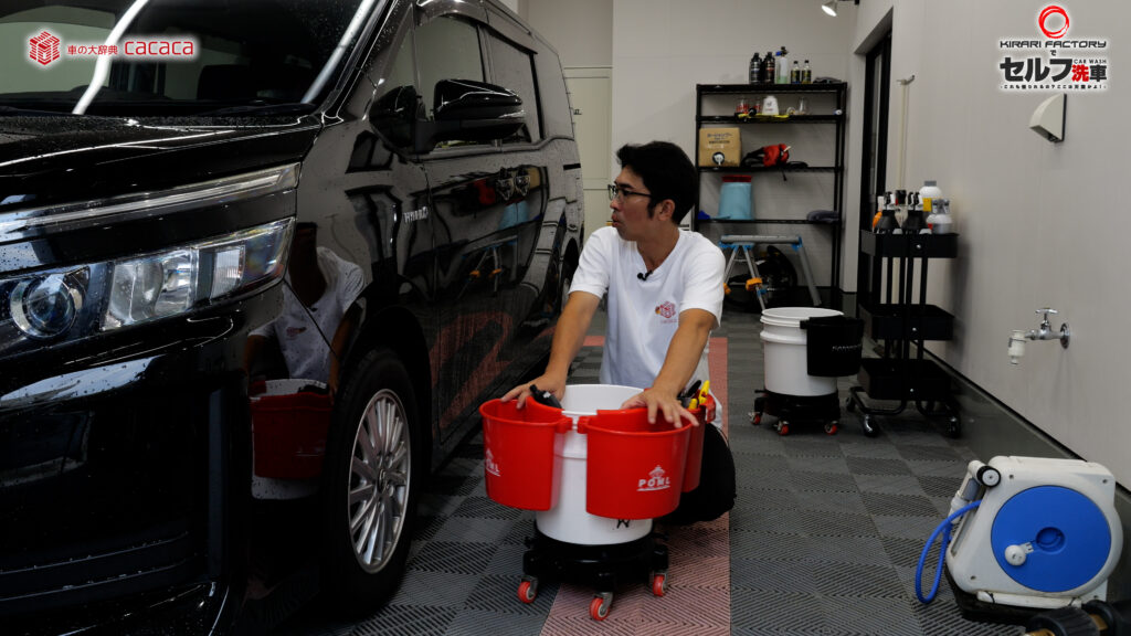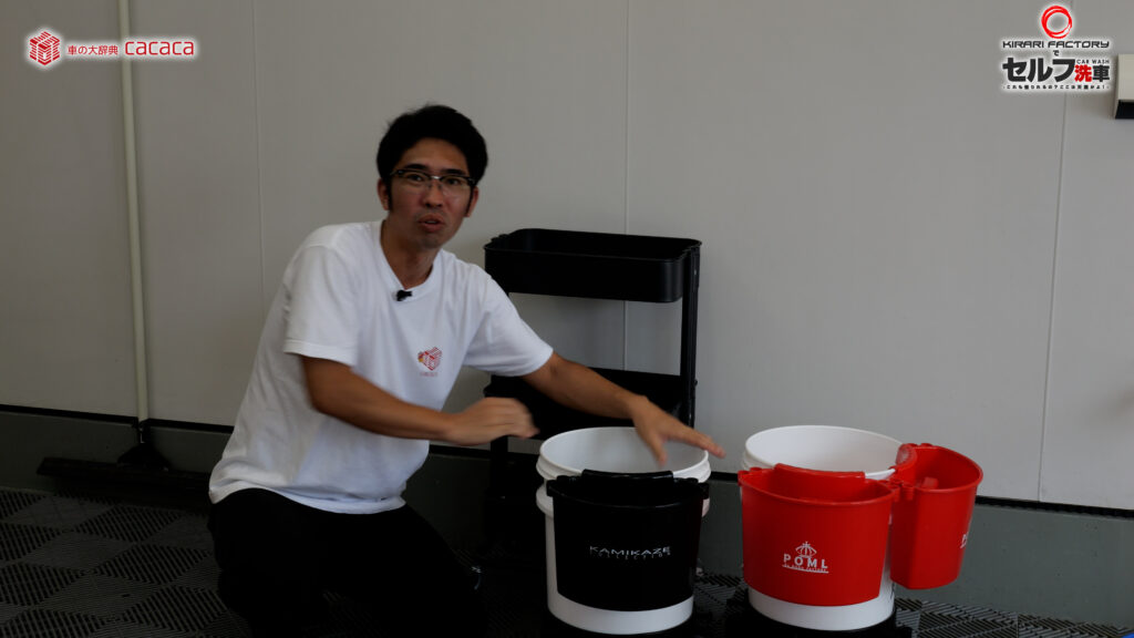 これも車を傷つけないためにバケツを2つ使って洗車ができる。