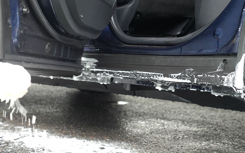 未塗装樹脂部分が終わったら下回り用のシャンプーとムートンを使って下回りを洗っていきます。僕は下回りをやる時は結構水多めです。