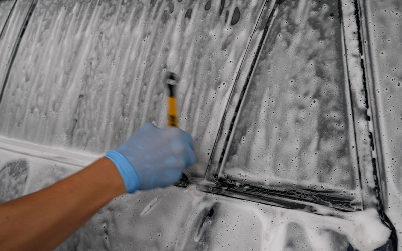 『マジフォーム』で泡々にしたらボディに干渉しないような細かい部分だけ刷毛でチャチャッとやっていきます。そうしたら流して次は普通に洗っていきます。