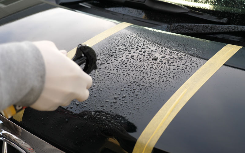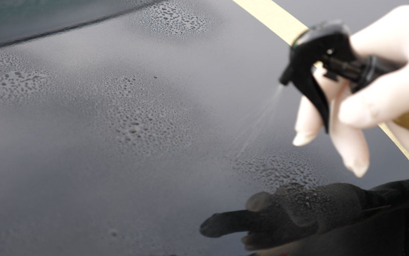 CARNANOを吹きかけます。この時に水が弾かれる感じがありません。ラメ入りの水を吹きかけているような感じです。