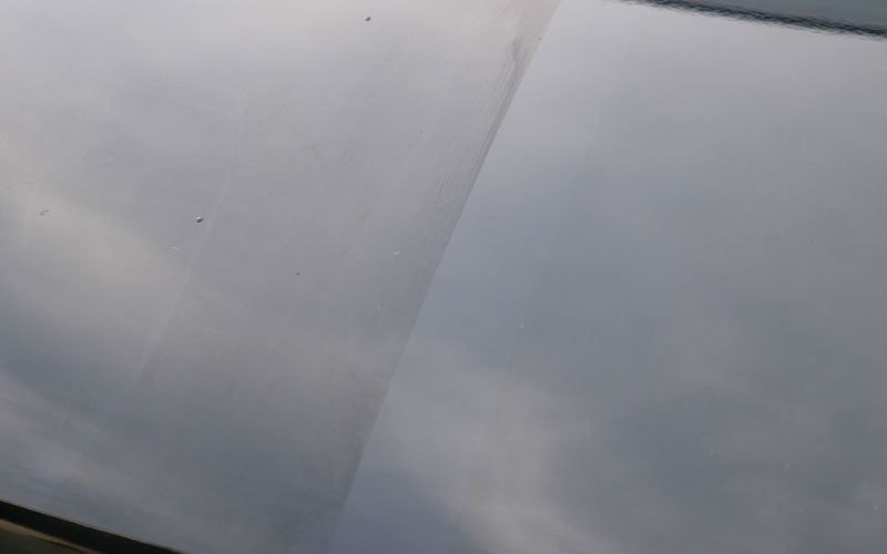 左側が乾いた状態で『CARNANO』を施工した面、右側がボディが濡れた状態で『CARNANO』を施工した面です。引きで見た時にツヤが出ているように見えたところです。ツヤではないです。逆に白く曇っています。