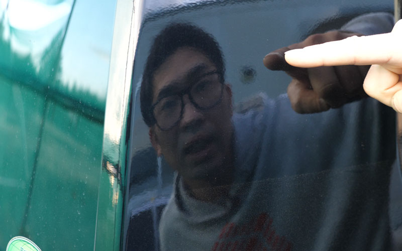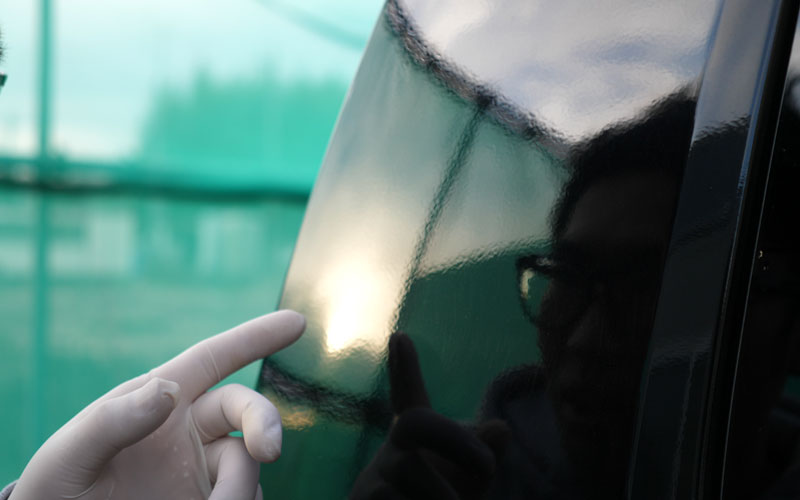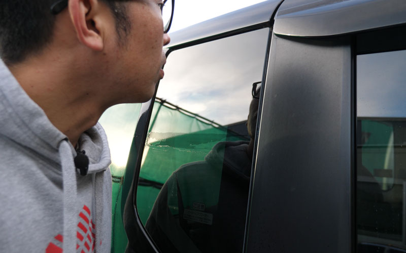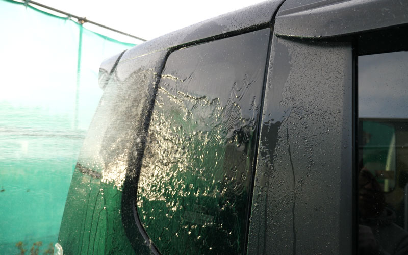 少し引きの映像なので見にくいかもしれませんが窓ガラスから見ていくと、水弾きは『レインドロップ』の方が圧倒的にいいです。『CARNANO』を施工した面は少し分かりづらいです。