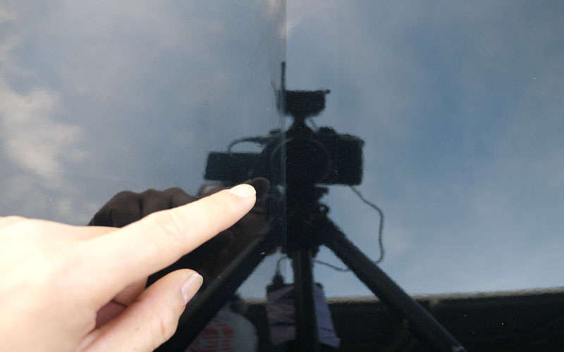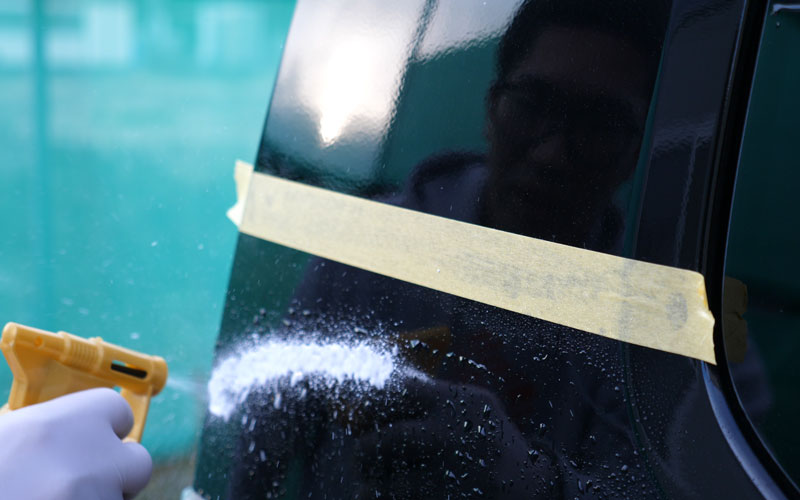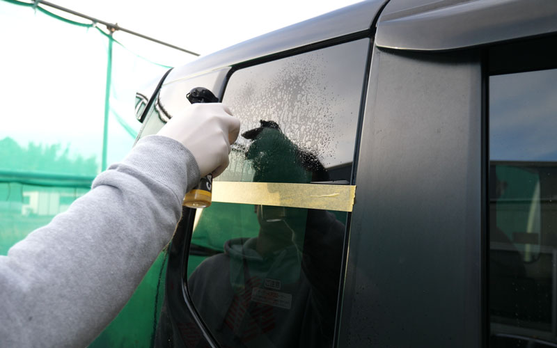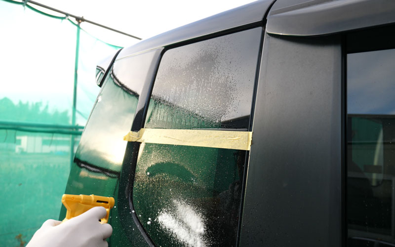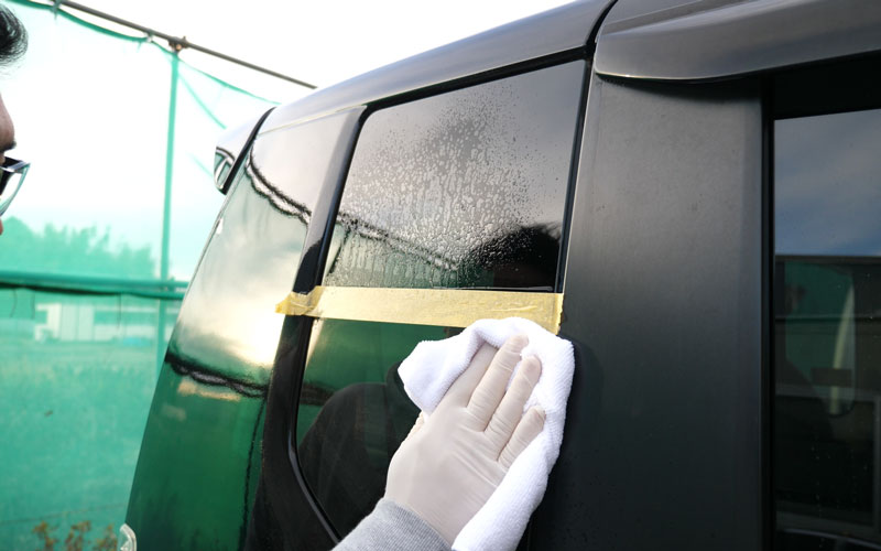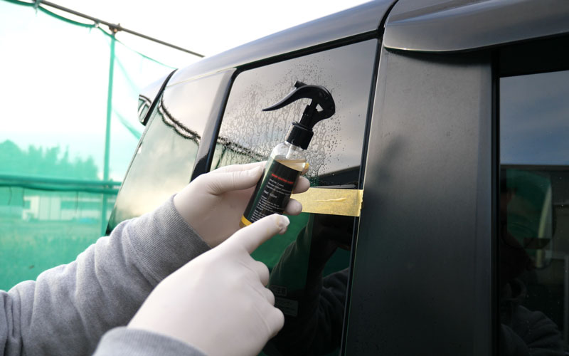続いてガラスに施工していこうと思います。施工するところは油膜などを落としておきました。なので 水弾きはありません。