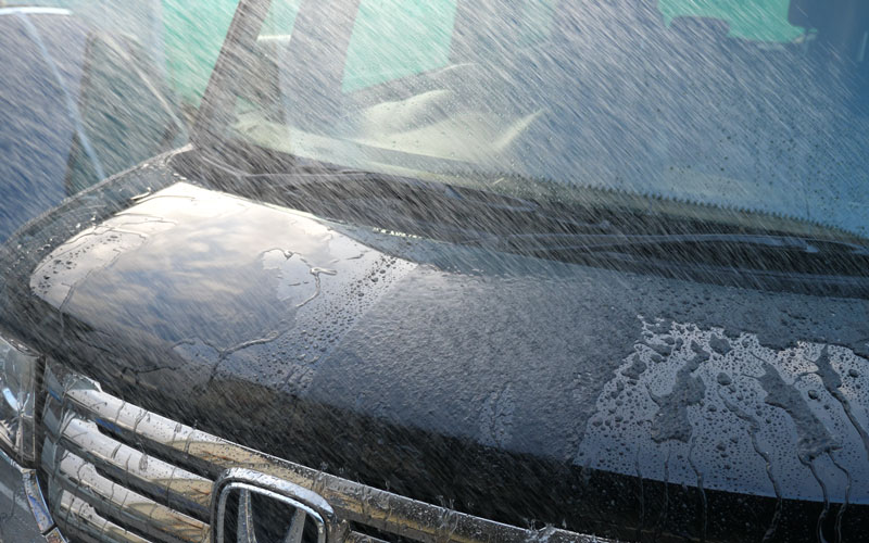 最初は洗わずに遠目から水をかけてみます。『CARNANO』を施工した面は撥水ではなく親水? 親水というよりコーティングが施されているのかどうかっていうレベルです。