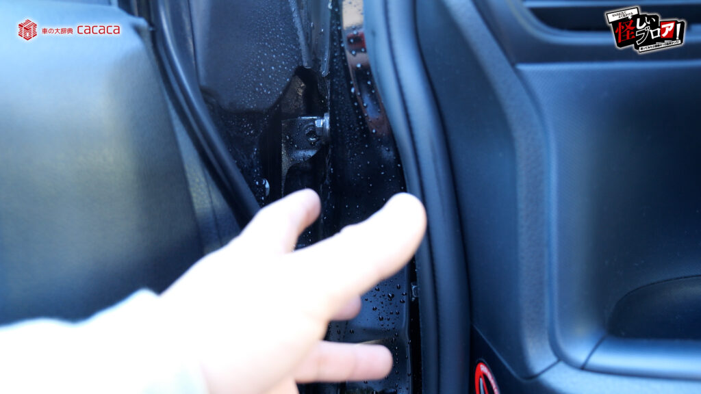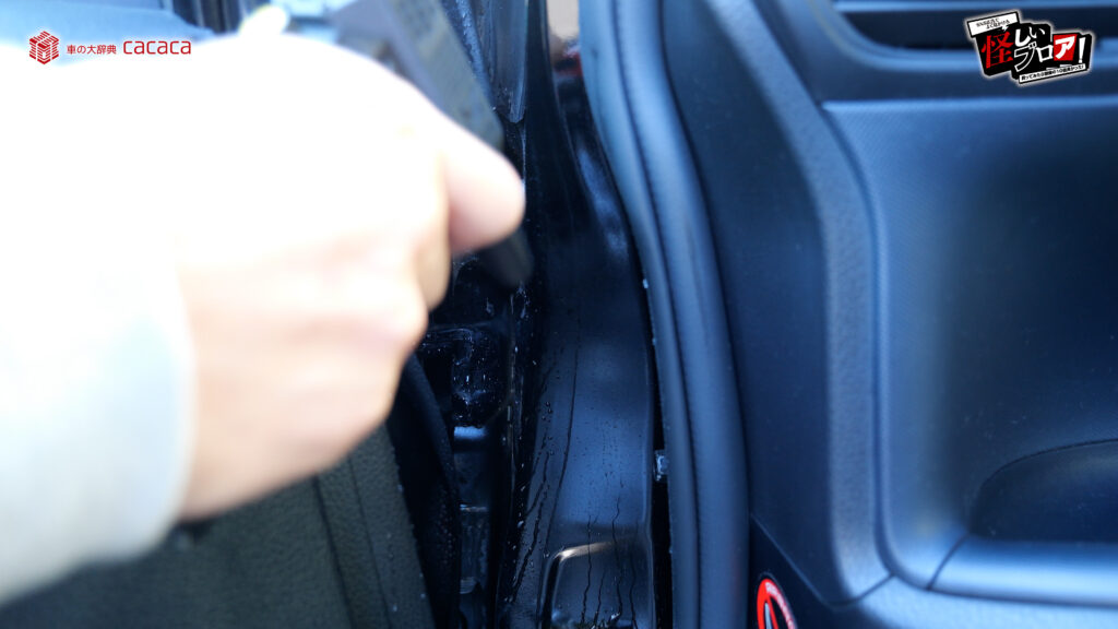 それこそ洗車後のこういったドアのヒンジ回りタオルで拭くのはちょっと大変なところだけど水は入ってしまって、それが乾いて白っぽくなってしまう。そういった所はこういったブロワーで…