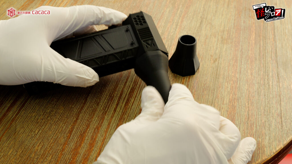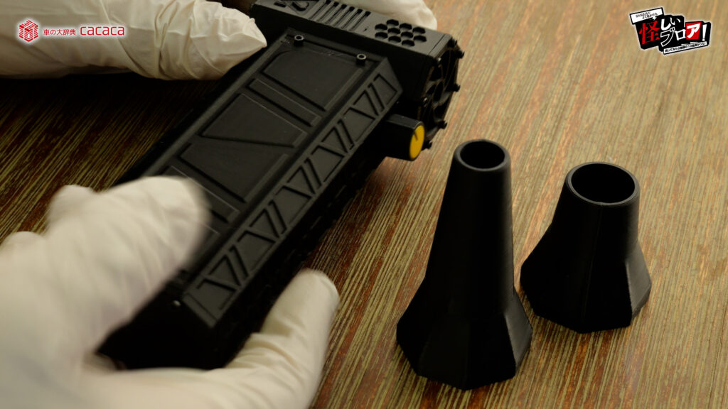 見た目は、マシンガンの弾ガチャンって入れるところみたいな感じで格好いいんですが、この外側が3Dプリンターで多分作られてるのかな?